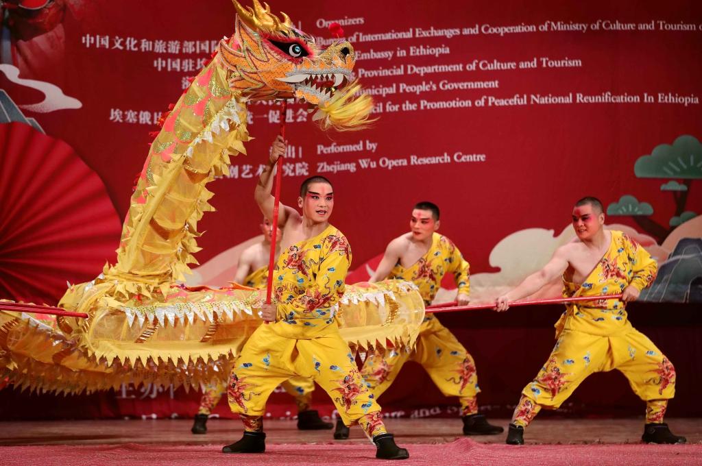9月9日,婺剧演员在埃塞俄比亚首都亚的斯亚贝巴表演《九节龙》。新华社记者 汪平 摄