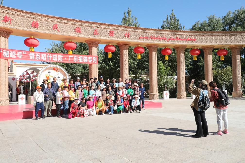 乘坐“穗疏号”广东援疆专列的广东游客,在“乐器村”合影留念(8月29日摄)。新华社发(王涛 摄)