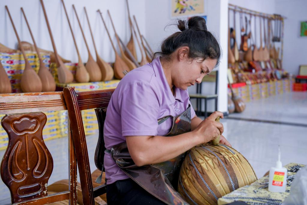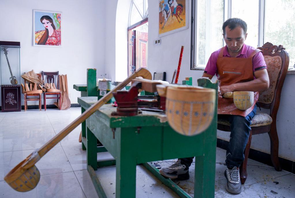 在“乐器村”民族乐器作坊,工匠在制作民族乐器(9月15日摄)。新华社记者 王菲 摄