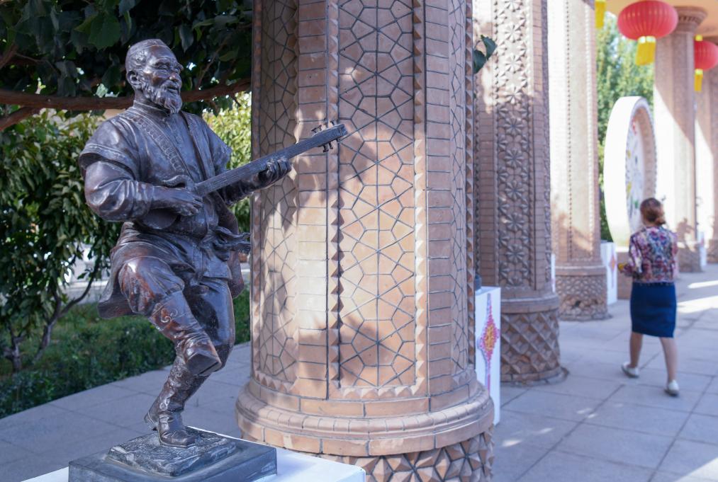 乘坐“穗疏号”广东援疆专列的广东游客,在“乐器村”拍照留念(8月29日摄)。新华社发(王涛 摄)