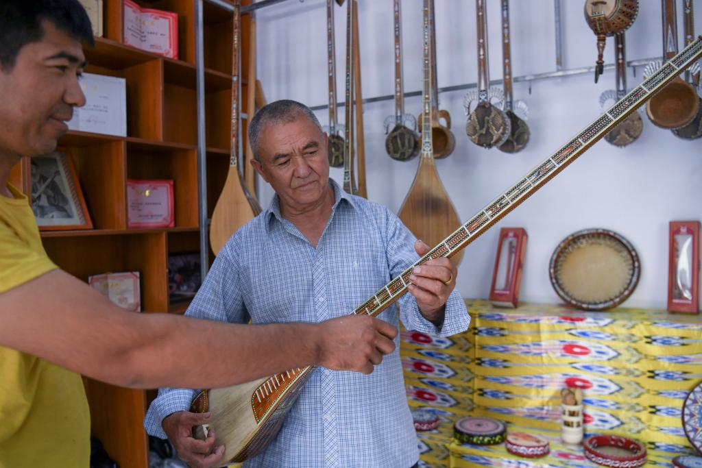 在“乐器村”民族乐器作坊,国家级非物质文化遗产项目民族乐器制作技艺代表性传承人热合曼·阿布都拉(右)在向儿子马穆提·热合曼传授民族乐器制作技艺(9月15日摄)。