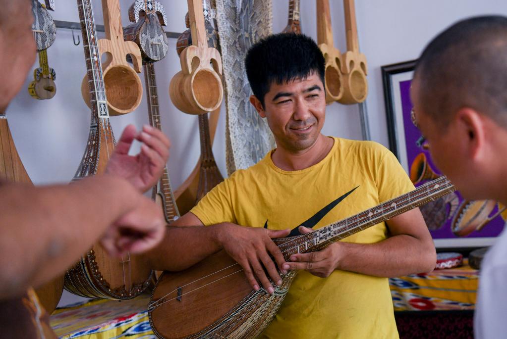 在“乐器村”民族乐器作坊,手艺人马穆提·热合曼(中)在向前来参观的人介绍民族乐器(9月15日摄)。