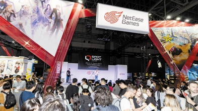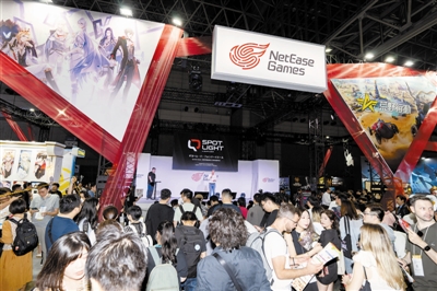 9月21日,在日本千叶县幕张展览馆的东京电玩展上,人们参观网易展台。
