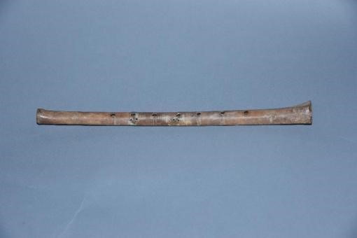 展览中,一件出土于河南省漯河市舞阳县贾湖遗址的贾湖骨笛吸引了不少观众的目光。据介绍,骨笛以鹤类动物的尺骨钻孔而成,是迄今为止我国发现最早、保存最完整的管乐器。