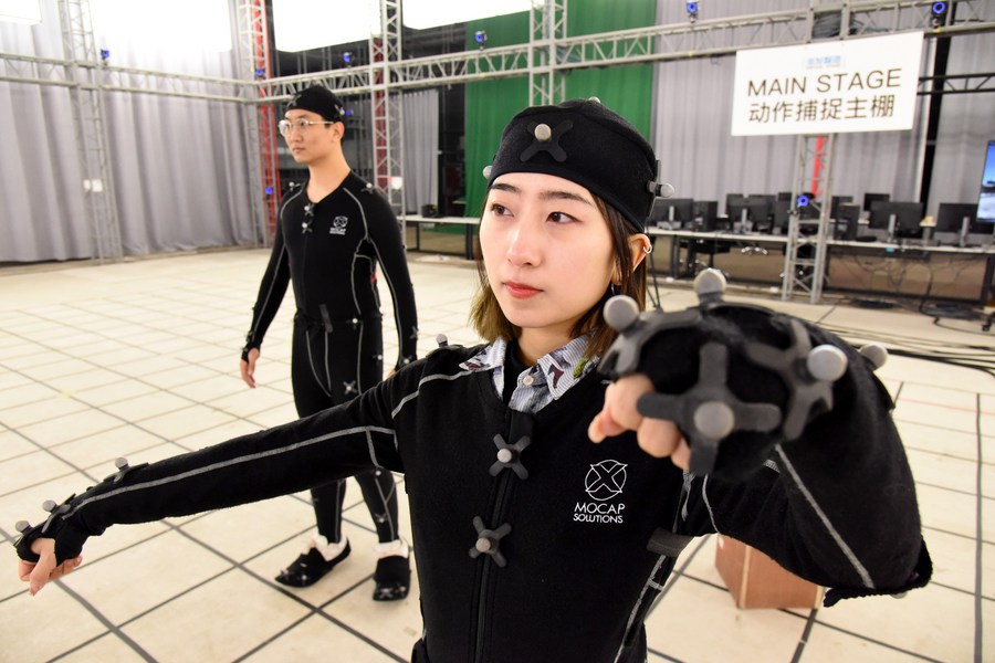 2月8日,青岛东方影都影视产业园工作人员在演示动作捕捉技术。新华社记者 李紫恒 摄