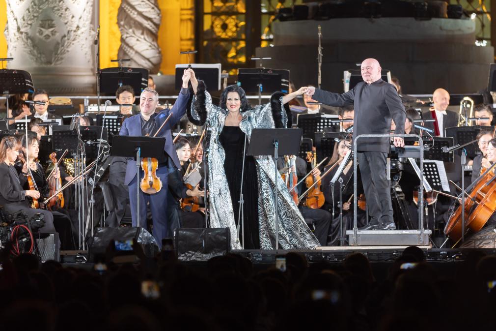 10月14日,在第22届中国上海国际艺术节首场开幕演出上,指挥家克里斯托夫·艾森巴赫、女高音歌唱家安吉拉·乔治乌、小提琴家马克西姆·文格洛夫(前排从右至左)在表演后向观众致意。新华社记者 王翔 摄