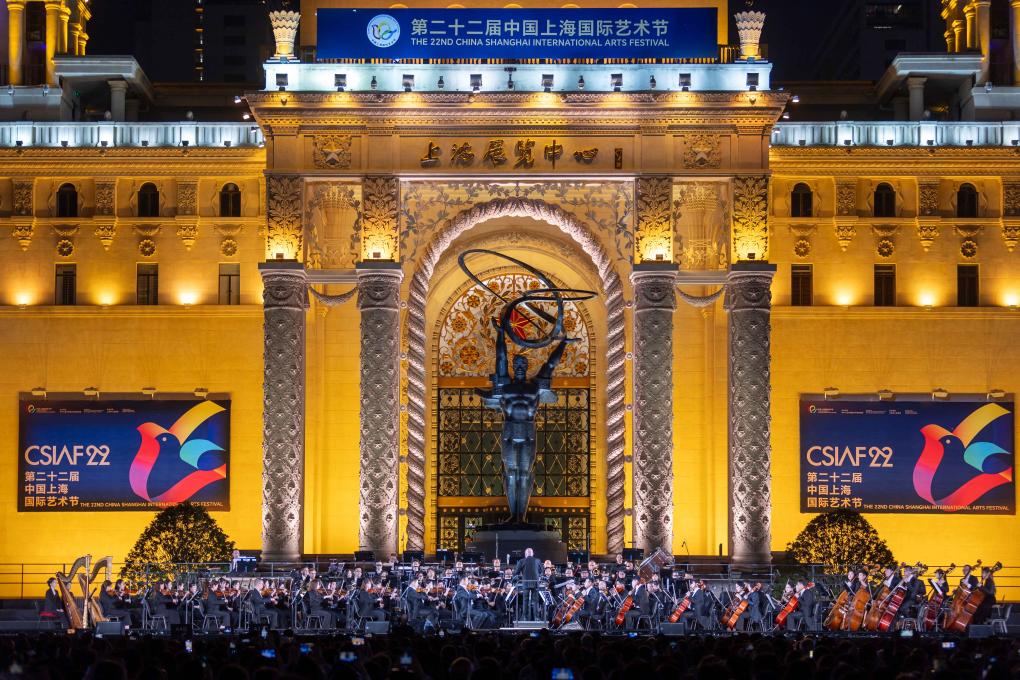 10月14日,第22届中国上海国际艺术节首场开幕演出在上海展览中心的喷水池广场举行。新华社记者 王翔 摄
