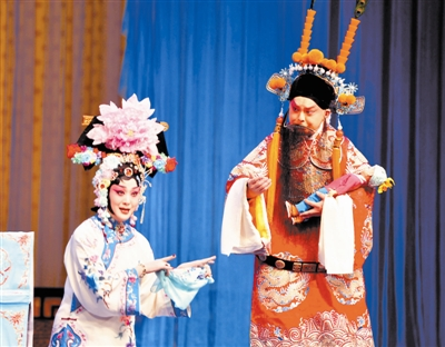 图为杨少彭(右)、王艳在剧中分别扮演杨延辉和铁镜公主。(记者王洋 记者庞剑摄)