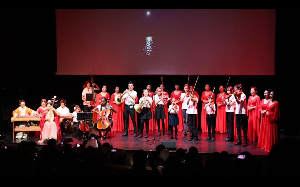 《但愿人长久》是最后一首表演曲目,演奏乐器有古筝、琵琶,也有提琴、圆号,演绎者中可以同时看到欧洲和亚洲面孔的孩子。