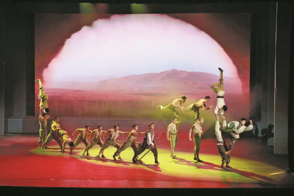 约140人组成的《天山雪》剧组跨越5500多公里,从上海奔赴新疆,巡演活动将历时20天,奔赴六个站点,共演出九场。图为《天山雪》剧照。(上海杂技团供图)