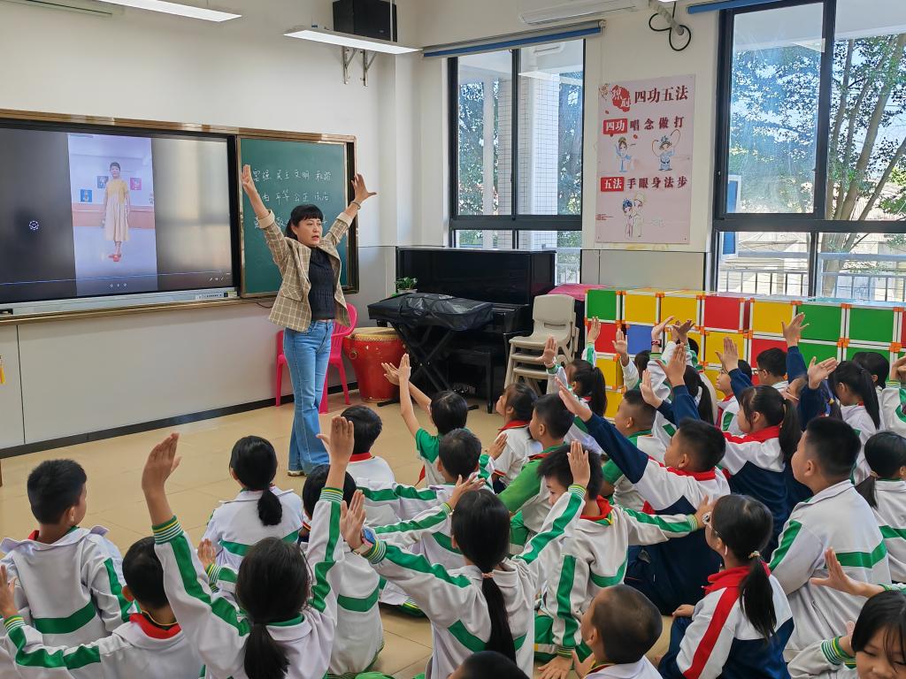 图为琼剧老师向定安县第一小学学生教授《琼剧美体操》。新华社记者刘邓 摄