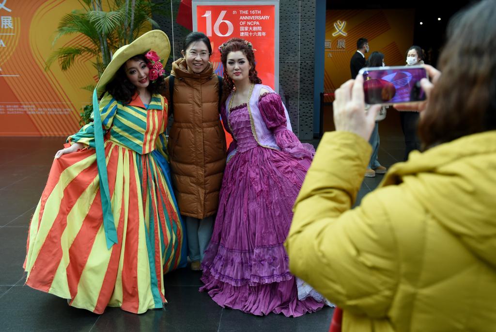 12月22日,观众在国家大剧院公共空间与身着剧目中舞台服饰的“剧中人”合影。新华社记者 罗晓光 摄