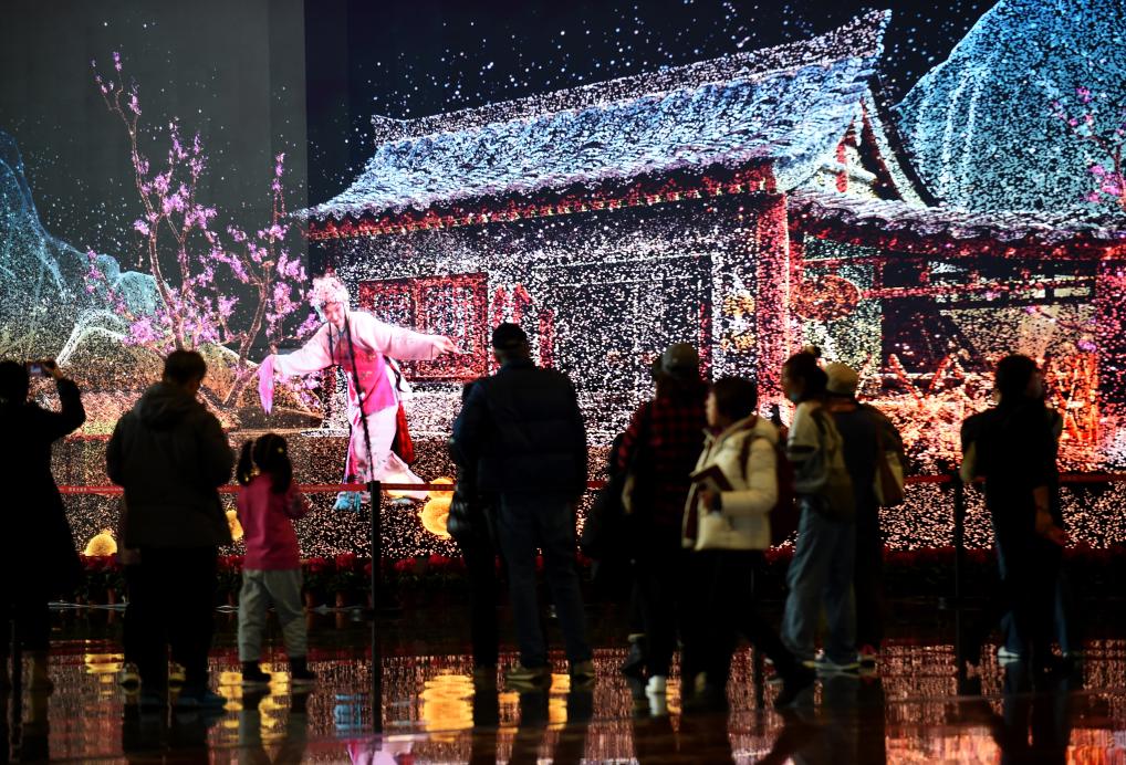 12月22日,观众在国家大剧院戏剧场入口观看裸眼3D大屏。新华社记者 罗晓光 摄