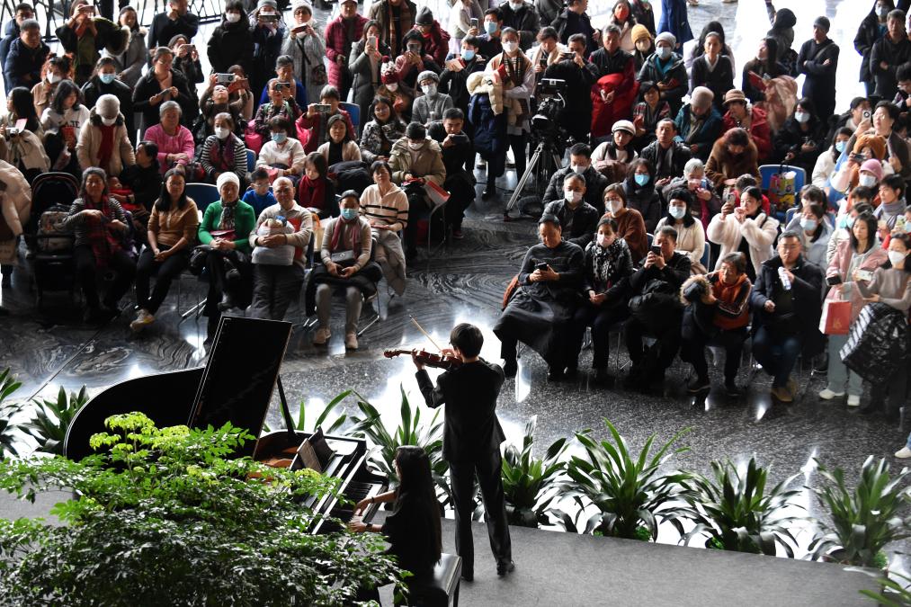 12月22日,观众在国家大剧院西咖啡厅前欣赏艺术家的小提琴与钢琴演奏。新华社记者 罗晓光 摄