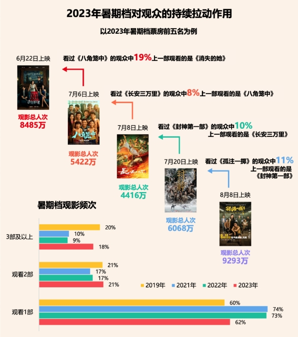 以2023年暑期档为例,观影人次和频次双双大幅上涨,拉动全年“看2部及以上观众”比例回升。从2023年6月底《消失的她》热映开始,大盘被快速带热,吸引了千万级新用户首次走进电影院结伴观影。《熊出没·伴我“熊芯”》《八角笼中》《长安三万里》等具有教育意义的影片,有效带动了家庭观影,尤其后者,二刷三刷的观众不在少数。