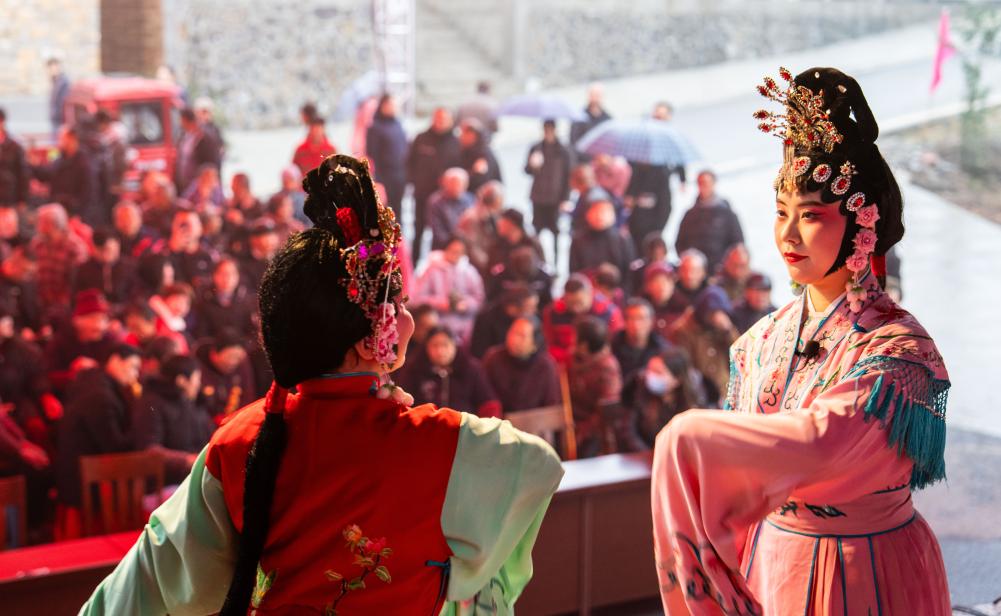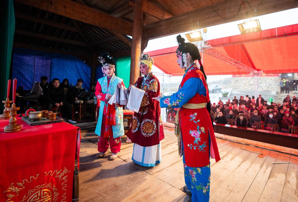 1月15日,演员在伊塘镇长木塘村表演祁剧《孟丽君》。