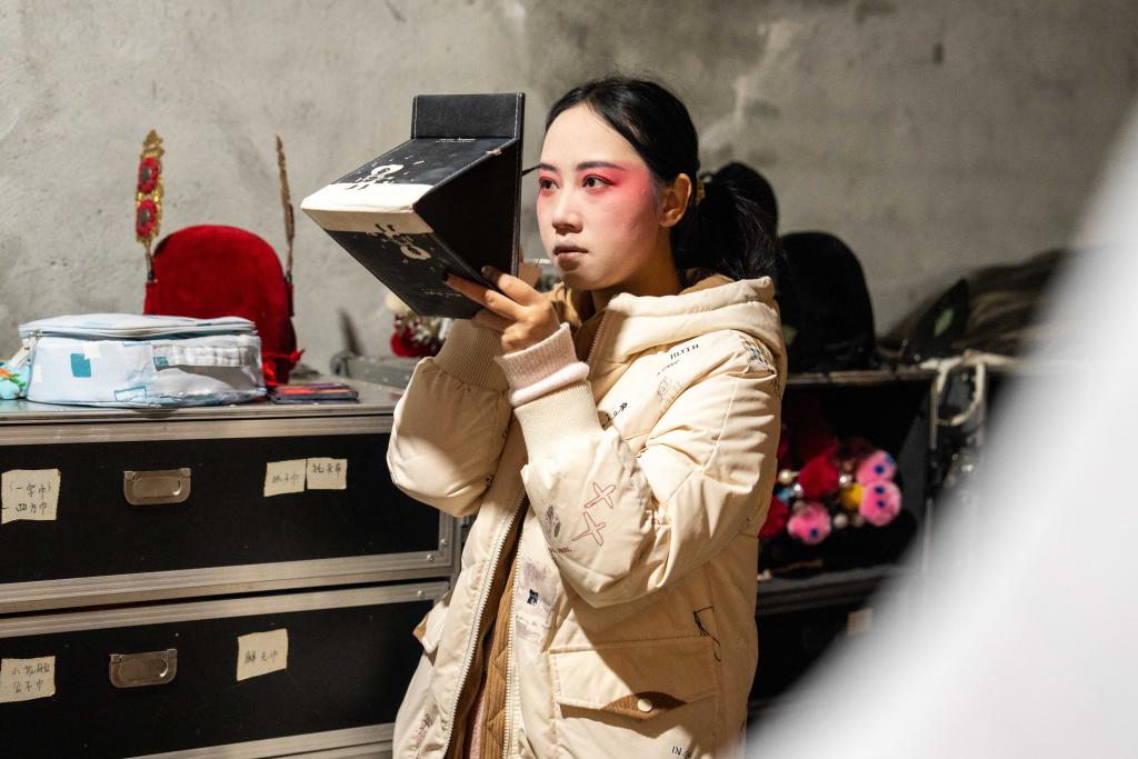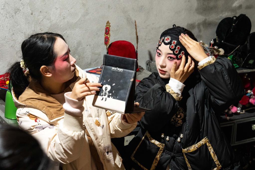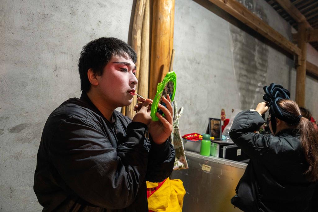 1月15日,在伊塘镇长木塘村,演员在后台做演出前的准备工作。新华社记者 陈思汗 摄