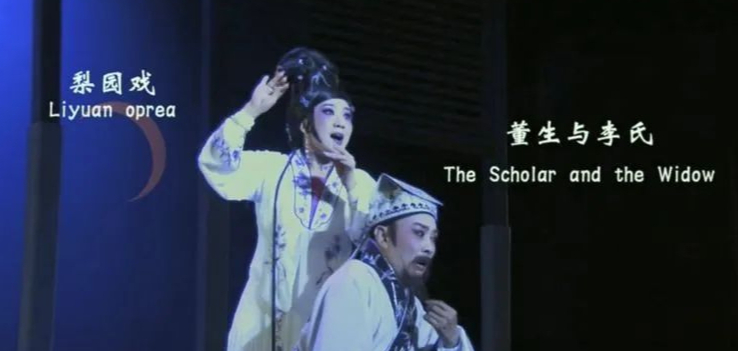 新版的《董生与李氏》用梨园戏最传统、最简洁的舞台样式作出了自己的回答。虽然舞台上方装饰着古建筑的框架,可是,在下方的表演区看不到任何具象的实景。彭员外的府第,隔巷相望的学馆,围墙,墙上的门,墙角的梧桐树,李氏住的西厢房,彭府内的曲径回廊……一切都是虚拟的,都是由演员的说唱和表演体现出来的。舞台上只有一个长长的平台,前半部稍稍向外倾斜,后半部稍稍向内倾斜。平台两侧分别垂着长长的帘子,左边的垂帘后面,是乐队的座位,观众可以清楚地看到乐手们的身姿;右边的垂帘后面是通向李氏居室的过道。