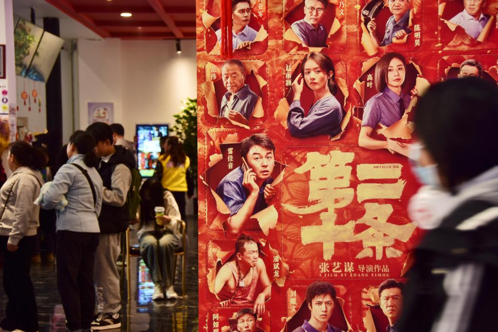 2月15日,观众从云南省红河哈尼族彝族自治州个旧市一家电影院的电影海报前经过。新华社发(薛莹莹摄)