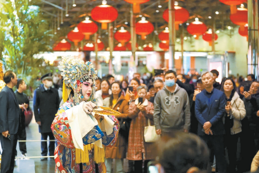 这个春节,剧院空间不约而同开起了一个个小“庙会”:北京人民艺术剧院贴福字、挂灯笼,处处喜气盎然,为纪念老舍诞辰125周年而策划的主题线上线下展、“学积有生”北京人艺舞美培训成果展多方位呈现这座戏剧殿堂的过往与未来;中山公园音乐堂邀观众拓印木版年画,上墨、覆纸、捶拓,“忙乱”中趣味十足;国家大剧院连演京剧《锁麟囊》《龙凤呈祥》《穆桂英挂帅》等6台经典好戏,从检票入场的一刻起,在北水下走廊等各个公共空间,薛湘灵、杨玉环等戏中人踏出舞台,一段段京剧快闪与观众不期而遇……