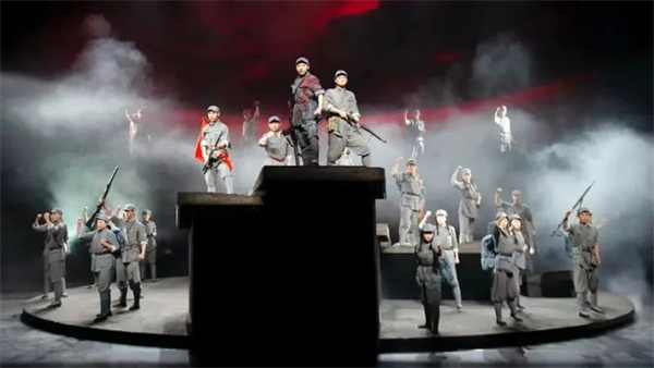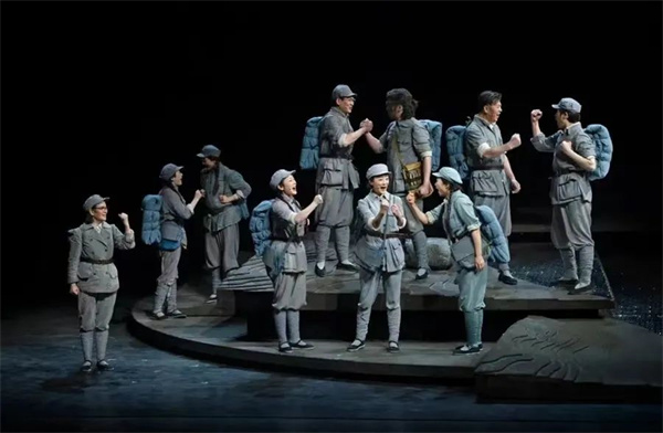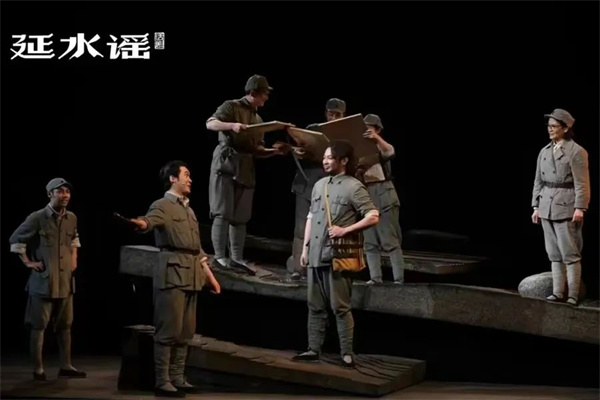《延水谣》的题材宏大,素材广博。如何切入,构成故事、提炼人物,真实地再现那个时代,展现那个时代青年的精神气质,把国家命运、民族命运、党的文艺路线和各个人物的命运钩织在一起,准确地呈现革命文艺精神,是一个较大的挑战。因此,话剧《延水谣》选取的是散点式的结构方式,通过三组典型人物的成长,多线叙事,由点及面,辐射到整个群体的方方面面。写出他们的个性、思想的冲突和观念的碰撞,人物的转变,心灵的痛苦以及人生道路的选择。他们当中既有“亭子间”出来的艺术家,也有“山顶上”下来的知识分子;有的来自普通百姓,也有的来自部队官兵,这些来自不同阶层的个体共同交织出了一个关于时代转折、个体命运、文艺创作的交响乐。在舞台呈现上,这部戏又尽可能地将“鲁艺”延安时期创作的文艺作品镶嵌其中,这些作品,堪称延安时期的红色文化之根,至今仍散发着迷人的光芒,璀璨夺目,生生不息,给我们以共鸣与引领。
