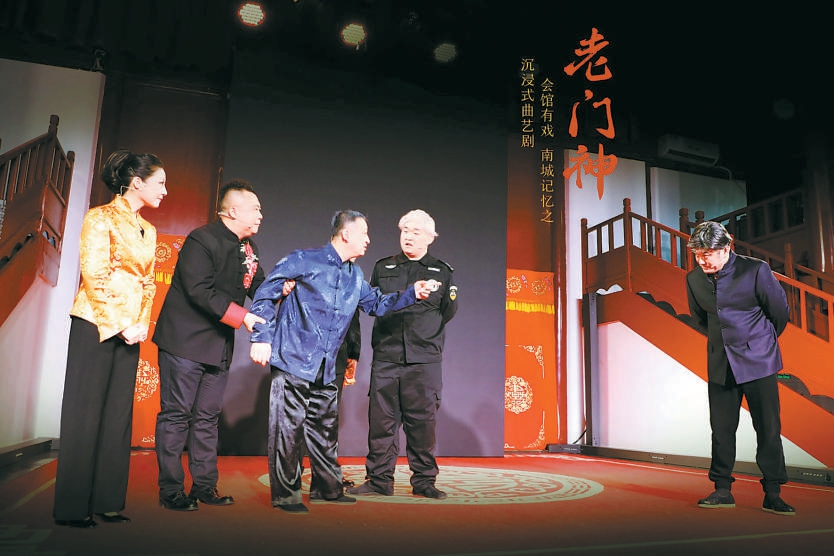近日,北京曲艺团首部沉浸式曲艺剧《南城记忆——“老门神”》在颜料会馆首演。这是一部戏与景深度交融的作品,它的创作灵感受到了曲艺团与热心的会馆保安交往经历的启迪,以会馆看门人“老门神”为切入点,引出昔年间北京南城老艺人的“艺”与“义”。8位性格鲜明的角色展示了单弦、大鼓、相声、快板等9种曲艺形式,其中不乏早已随着社会发展淡出舞台的拉洋片、牛骨数来宝,近在咫尺的表演和互动极大地添加了观演乐趣。比如,观众入席时,桌上已提前备好了铜钱,方便大家慷慨地“捧个钱场”,亲身感受一把拉洋片也是如今越来越难得的一种体验。