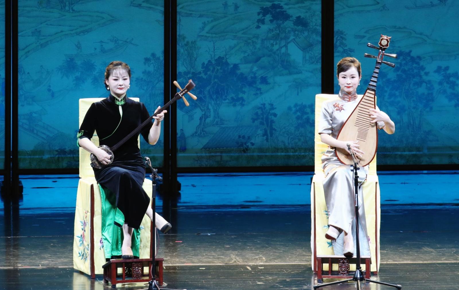 几扇山水屏风分立掩映,光影朦胧,琵琶拨响。“上有呀天堂,下有呀苏杭”,吴侬软语唱起“正月里梅花开,二月里玉兰放”的胜景,一段大九连环《姑苏好风光》百转千回,把江南的诗意柔情送到了观众的眼前耳畔。