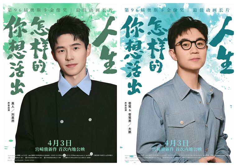 刘昊然和大鹏为《你想活出怎样的人生》中文版的真人、苍鹭及苍鹭男配音。