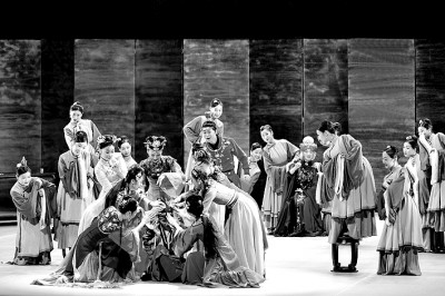 小说《红楼梦》全书共120回,详尽地写出了贾王史薛四大家族的兴衰历程。民族舞剧《红楼梦》通过有侧重的取舍,将庞大的故事篇章改编成2小时左右的舞剧作品,在结构布局上格外用心。该剧采取章回体的形式,分为“入府”“幻境”“含酸”“省亲”“游园”“葬花”“元宵”“丢玉”等12个篇章,以宝玉和黛玉、宝钗的爱情故事为主线串联起红楼一梦。刘姥姥进大观园、元妃省亲、黛玉葬花等经典段落在舞剧中都有大篇幅的呈现。剧中并没有华丽的制景,却能把观众带进大观园的氛围和人物内心。如十二钗站在十二张立起的椅子上的一段群舞,配合着冷色调幽闭的灯光,十二钗更像是冷峻的雕塑群像,命运的起伏霎时呈现在观众面前。