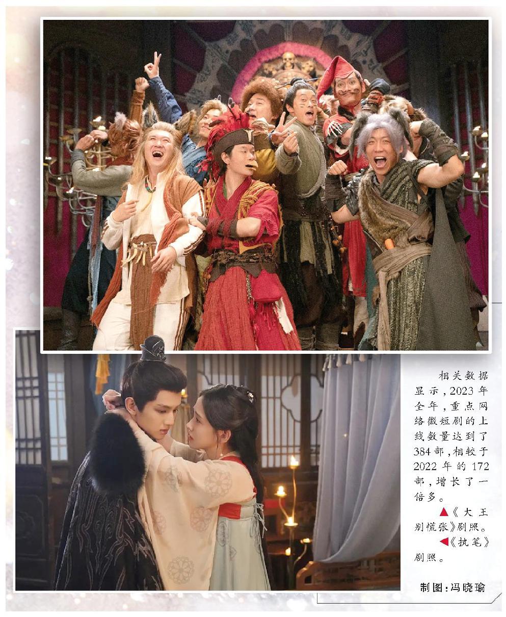 相关数据显示,2023年全年,重点网络微短剧的上线数量达到了384部,相较于2022年的172部,增长了一倍多。《大王别慌张》剧照。《执笔》剧照。制图:冯晓瑜