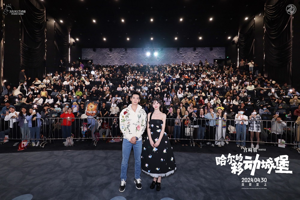 作为影片的中文版配音演员,于适和田曦薇备受关注,现场放映结束后也公开分享了为角色配音的感受。于适表示接到这次配音工作的时候,“有压力的部分是跟角色相关,但既然走进了录音棚就认真做好。”也表达了自己对宫崎骏导演的敬仰,他说“很庆幸有宫崎骏这么棒的艺术家,能够给我们带来这么多经典的作品,这是《哈尔的移动城堡》首次进入内地院线上映。人间最美四月天,现在正好是四月,是一个美好的季节,希望大家能够走进影院欣赏一下宫崎骏老师的作品。”也和大家分享了哈尔最吸引自己的地方,是他身上“展现出来的天真孩子气的那一面,他很酷很拽,但是又有这种孩子气,天真无邪的样子”。