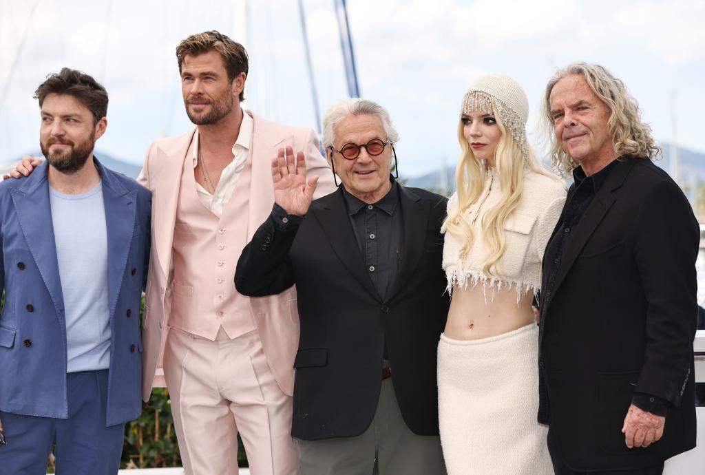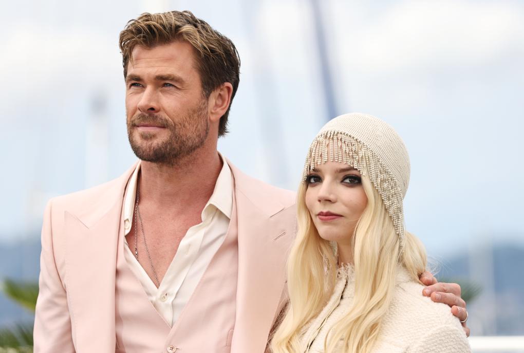 5月16日,在法国戛纳举行的第77届戛纳国际电影节上,非竞赛单元影片《疯狂的麦克斯:狂暴女神》的主演克里斯·海姆斯沃斯(左)和安雅·泰勒-乔伊亮相拍照式。新华社记者 高静 摄