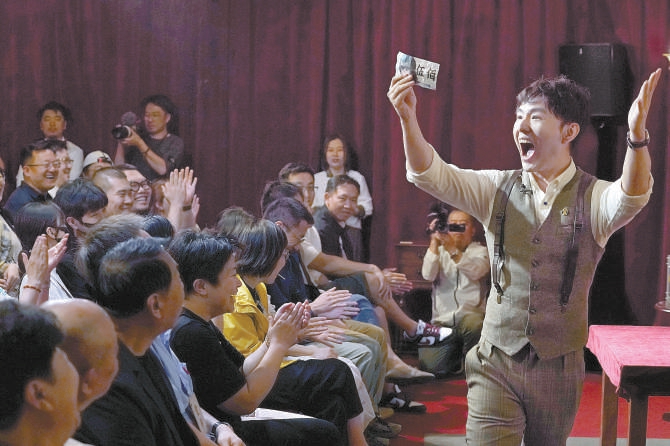 邓男子(右)在观众面前展示近景魔术。记者 方非 摄