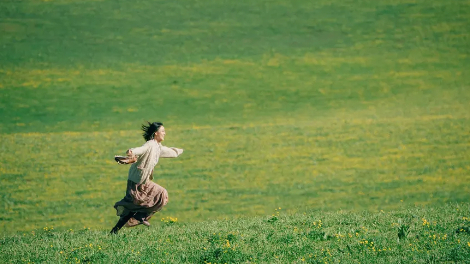 诗意的镜头语言和电影般质感的画面最具视觉冲击感,剧中展现的那延绵起伏般的雪山、安静幽深的森林、满目青翠的草原、清冽见底的河流、缓缓流动的羊群,英俊的哈萨克族青年骑着骏马迎风奔驰,汉族少女如飞翔般奔跑而过,星星点点的白色毡房洒落在绿茵茵的草地上,每一帧都是一幅人景合一、人与自然和谐共处的美丽画卷。这对久在钢筋水泥丛林里的城市人来说,无疑是抚慰人心、治愈焦虑的一剂良药。去过新疆的人都知道,站在新疆广袤辽阔的大地上,才明白什么叫天地有大美而不言,才明白在大自然面前人如砂砾之渺小,再大的烦恼与焦虑到这里都无足道矣,这便是新疆这片土地的神奇之处。