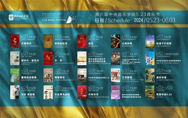 本届音乐节历时10天,将举办《光耀神州——中央音乐学院5.23音乐节开幕式音乐会》《您好 焦裕禄——沉浸式党性教育课程》《颂歌献给党——中央音乐学院音乐党课走进国家教育行政学院》《璀璨管弦——杭州爱乐乐团室内乐音乐会》《毕业季马拉松——中央音乐学院毕业生推介音乐会》《“延安”音乐舞蹈史诗》《中央音乐学院拔尖创新人才专场音乐会》《乐咏中华——中央音乐学院音乐党课进敦煌》《山海和鸣——民族情歌音乐会》《给孩子们的歌——儿童作品专场音乐会》《盛世华章——中央音乐学院5.23音乐节闭幕式音乐会》等主题鲜明、内容丰富的系列艺术活动。