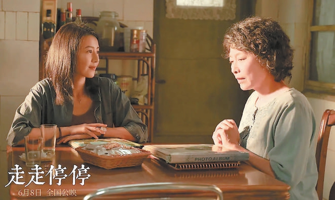 岳红(右)在《走走停停》中饰演一位睿智隐忍豁达的母亲。
