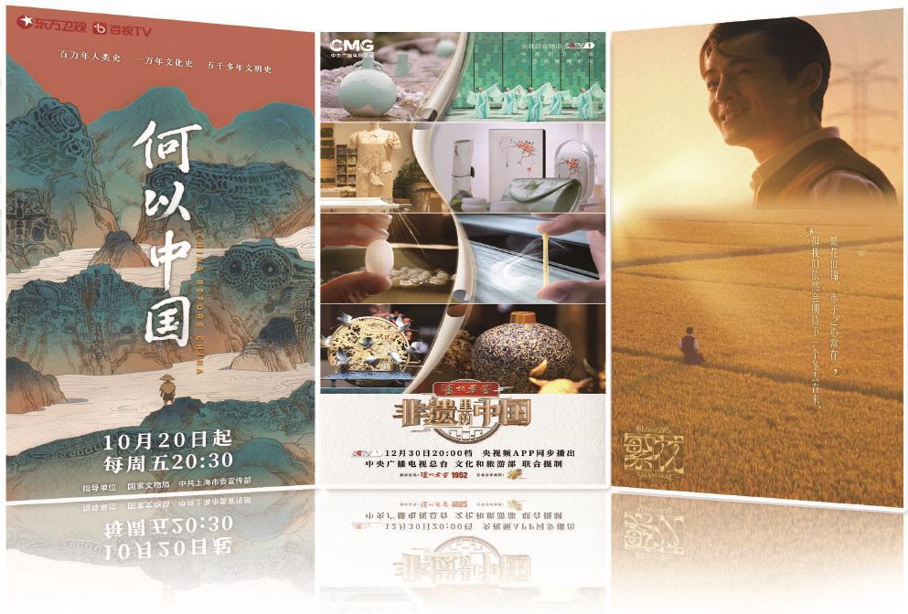 左起依次为《何以中国》《非遗里的中国》《繁花》海报。