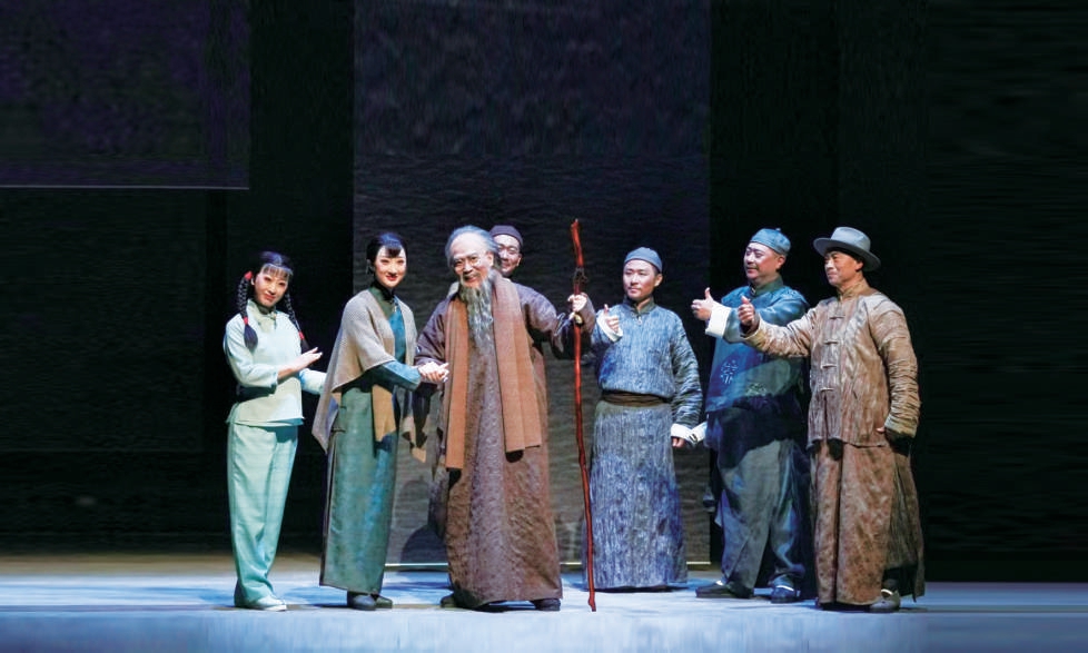 为综合运用视听语汇生动展现极具浪漫主义的舞台风格,《齐白石》巧妙运用前后场舞台空间区隔和灯光设置,使虚实、动静、音画、明暗和谐共生。牌楼、胡同、宣纸等元素自然透露出时代背景下的人物身份、情绪走向和舞台氛围,服装、化妆、造型、道具的设计糅合时代感与个性化,与全剧氛围相辅相成。身着长袍、手拄木杖,银发白须的齐白石一亮相便形神兼备,令人信服。