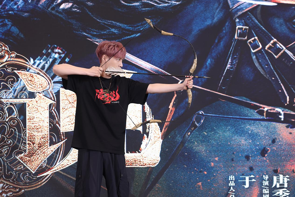说起在新疆拍戏的经历,张艺兴很兴奋。他表示特别喜欢新疆拍戏的节奏:“新疆的白天特别长,就感觉好像一直没有黑天一样,拍打戏从早上一直拍,一问时间,晚上11点了,但天还是亮的,特别喜欢这个节奏。”他在现场展示了自己精心设计过的武器——一把在两边加上短刃的弓。张艺兴透露,这是他饰演的西汉将领华峻使用的武器,既可以远距离射杀敌人,也可以近战对抗敌人:“设计了这个弓之后,大哥就一直陪我套招,我所有的动作都是大哥帮我套的。”