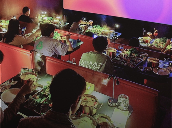 四川省成都市的三克映画影院内,观众在边吃火锅边看电影。三克映画供图