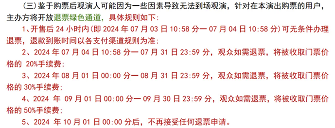 2023年9月,文化和旅游部与公安部联合印发了《关于进一步加强大型营业性演出活动规范管理促进演出市场健康有序发展的通知》,要求“演出举办单位应当建立大型演出活动退票机制,设定合理的梯次退票收费标准,保障购票人的正当退票权利”。从现实情况看,该规定使演出门票“一经售出,概不退换”现象大大减少,但对于“梯次退票收费标准”语焉不详,缺乏具体指导性。