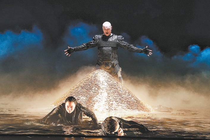 如此“激进”的舞台表达,必然引起观众两极分化的讨论,有人喜爱其大胆,也有人质疑其越界,比如,一些观众提及,现场水池和沙粒搅动产生的噪声干扰了歌唱、演奏的传递,某些特定的肢体动作也可能影响歌唱家的发挥——诠释歌剧作品,视觉与听觉的界限究竟在何处是一个老生常谈的话题,《莱茵的黄金》首轮演出中出现的观感冲突,值得国家大剧院在后续复排以及制作“指环”其他作品时斟酌留意。但总的来说,在为经典歌剧寻找现代表达的层面,这一版《莱茵的黄金》给出了一个来自当代中国的回答,足够先锋、开放且有诚意。