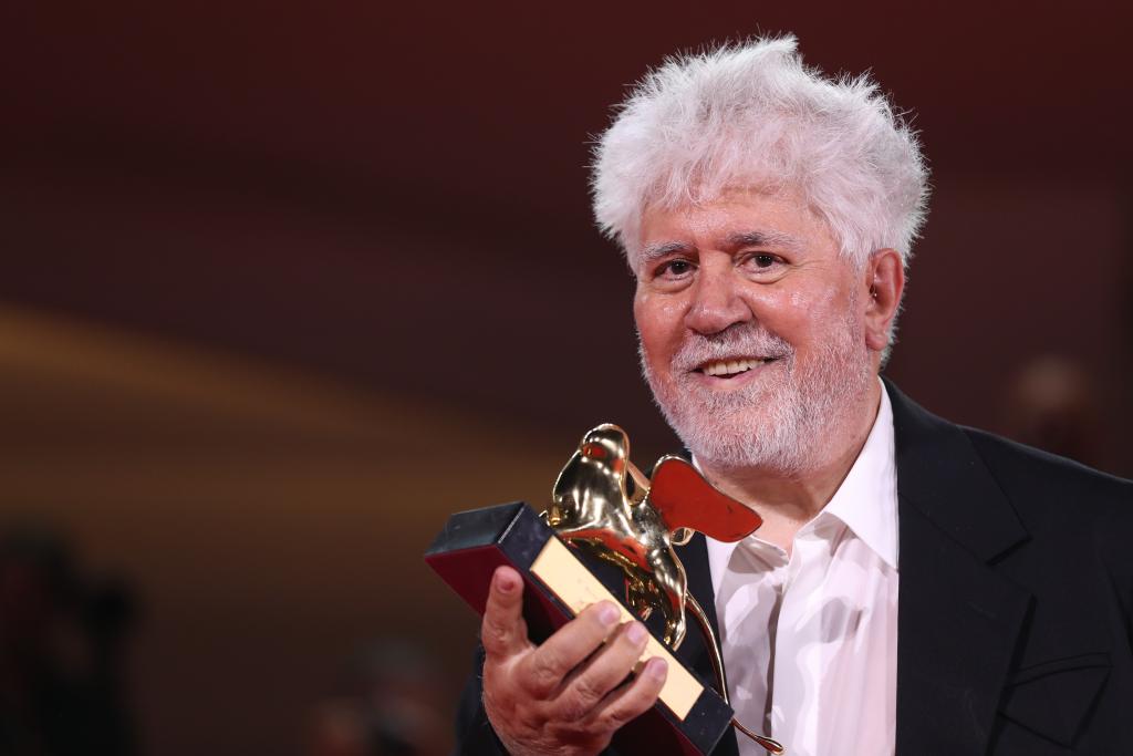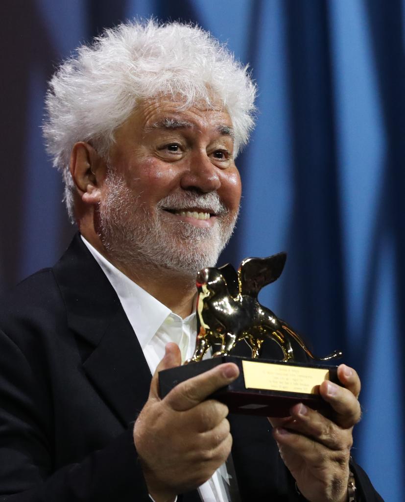 9月7日,在意大利威尼斯,凭借影片《隔壁房间》获得最佳影片金狮奖的西班牙导演佩德罗·阿莫多瓦与金狮奖杯合影。新华社记者 李京 摄
