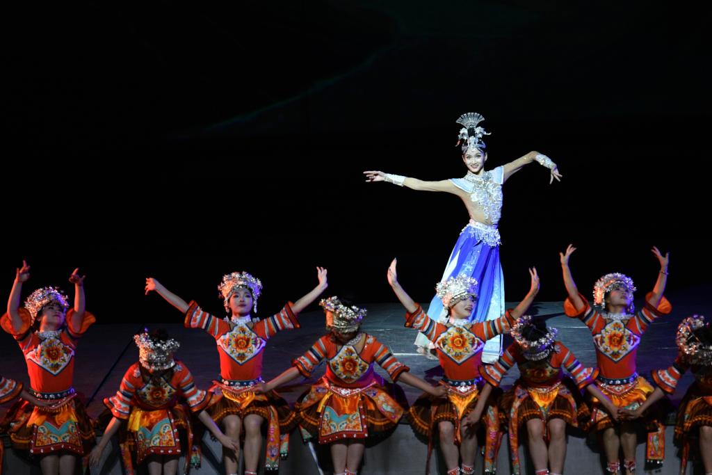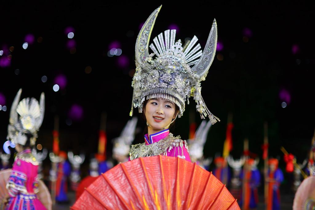 9月20日,演员在贵州省雷山县大塘镇表演苗族歌舞诗剧《仰欧桑》。新华社发(杨武魁摄)