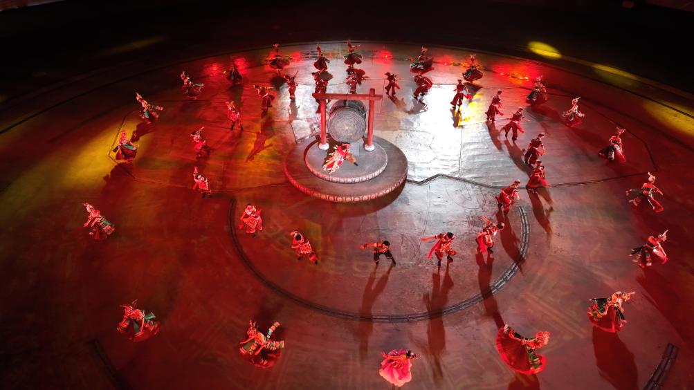 9月20日晚,演员在贵州省雷山县大塘镇表演苗族歌舞诗剧《仰欧桑》(无人机照片)。新华社记者 杨文斌 摄