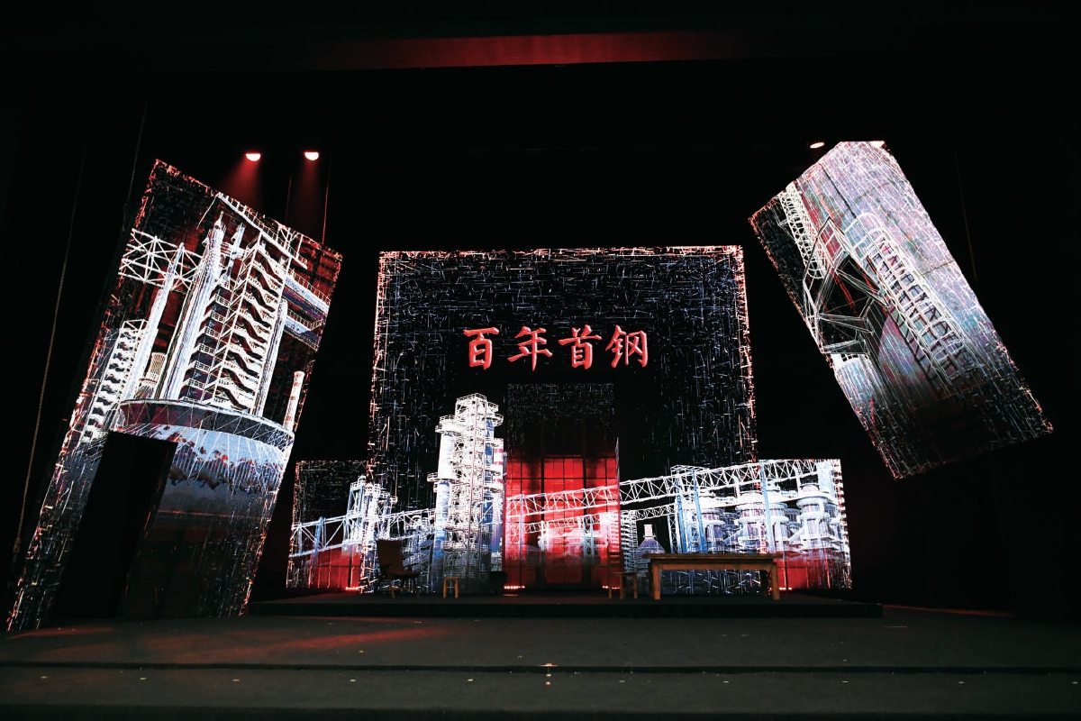 “《百年首钢》的舞台主要由‘三块钢板’和一个四合院的门楼组成。其中四合院的门楼是主体形象,通过这个主体形象可以告诉观众这部剧的发生地点,也是告诉观众剧中情节就是现实生活的身边事;‘三块钢板’其实是LED屏和冰屏,构建了整部剧的戏剧空间。通过在这三块屏上投射首钢不同时期的影像,展现整部剧的时代变迁,为整部剧的剧情推进烘托环境氛围,并对角色的精神世界进行拓展以及具象化的刻画与呈现。”据王筱頔介绍,除了运用LED屏和冰屏等现代化的舞美手段,为了便于空间自由切换,转换自如,此次舞台设计还加入了车台设计,让整出戏显得更加流畅。
