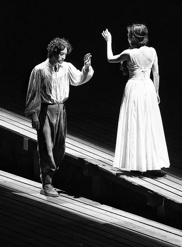 然而,更大的剧场直接带来了观演距离、舞台呈现的改变。与小剧场的版本相比,现在的舞美设计在保留原有风格的基础上进一步拓展空间,搭建二楼,增加表演区和高低差,明暗交替的灯光、往复涌动的音乐流淌其间,不断暗喻角色的感情变化和命运走向。如何继续在这方舞台上把小剧场的质感带给观众,排练时,于明加一度“很焦虑”。主创团队用了很多精力反复调整调度,比如,演员频繁走上距观众更近的乐池表演,爱碧与伊本的一眼对望,也从彼此平视改为了楼上楼下。“哪怕是大剧场最后一排观众,我也希望能让大家清楚地感受到角色内心的伤痛,传递足够的思考。”于明加说。