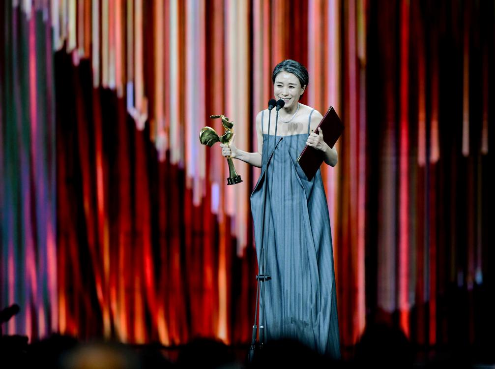 11月16日,刘丹在台上领奖。刘丹凭借《乘船而去》获得最佳女配角奖。新华社记者魏培全摄
