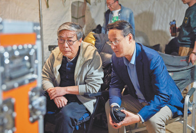 图为《西北岁月》总导演董亚春(左)和总制片人王勇在工作中。