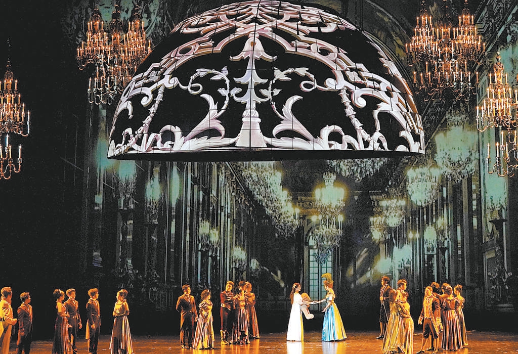 与壮阔宏大的作品立意相匹配的,是当得起华美二字的舞台呈现。璀璨的吊灯、长长的楼梯等鲜明意象不断出现,简洁的布景与流动的影像虚实交织,把辉煌的宫廷、幽静的乡村、无垠的星空等场景营造得深邃动人。其中,由多块LED屏拼成的圆弧最引人注目,在舞美设计维亚切斯拉夫·奥库涅夫的解读中,和平的宁静短暂降临时,圆弧可以随影像变幻为宫殿穹顶、简洁的花园凉亭,为生活遮风挡雨;战争袭来,刺目的红光从破裂崩碎的圆弧中迸溅而出,恰如满目疮痍、生灵涂炭的现实。最终,几瓣圆弧拼成碧水青山的“地球”,呼应原著小说标题中的俄语单词“Mip”,即“世界”,将作品的意境再次推上新的高点。